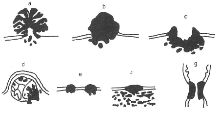 La figure 1 montre différentes formes de cancer vues de l’extérieur. Il peut s’agir d’un véritable chou-fleur (a), d’une tumeur nodulaire (b), ulcérale (c), du sein (d), placée à l’intérieur d’un tube (g) (œsophage) … cutanée (e-f).