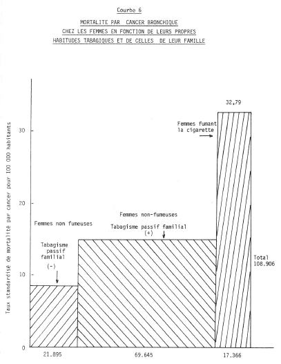 La courbe 6 montre la mortalité par cancer bronchique chez les femmes en fonction de leurs propres habitudes tabagiques et de celles de leur famille. Le fait de vivre dans une atmosphère « enfumée » sans fumer double les risques d’avoir un cancer bronchique.