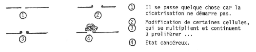 La figure 2 nous aide à comprendre le mécanisme du cancer. Les 5 premiers schémas expliquent le phénomène de cicatrisation normale, les 4 derniers, celui du cancer.