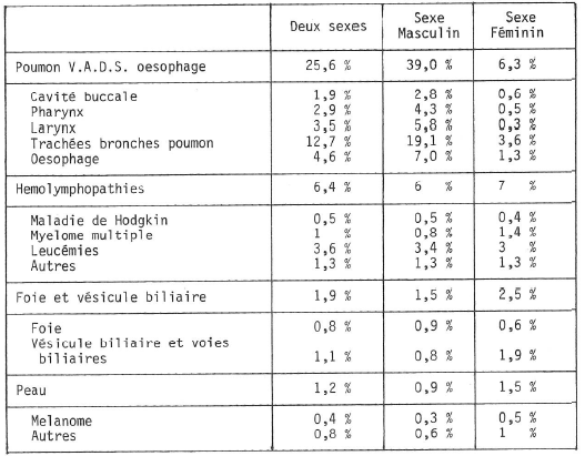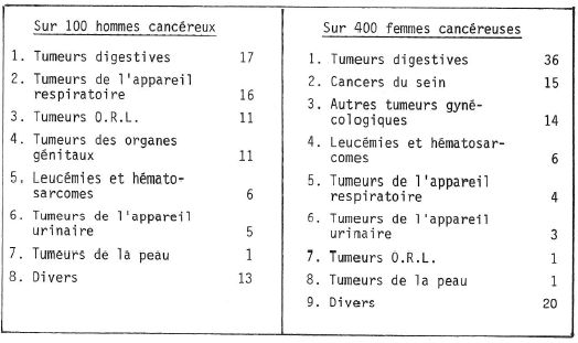 Le tableau 1 nous indique la fréquence relative des différents cancers en France selon le sexe (cancers qui ne sont pas obligatoirement suivis de la mort).