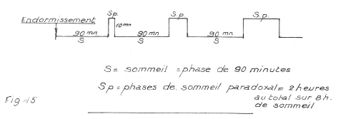 Au cours de la nuit, on enregistre 5 ou 6 phases paradoxales de rêve, dont la durée s’allonge peu à peu, alors que l’intervalle entre deux périodes de rêve a tendance à se raccourcir. (fig. 15)