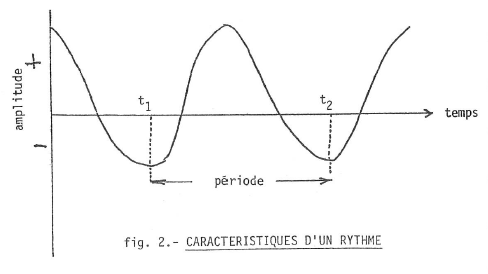 Le rythme est caractérisé par la fréquence (80 à la minute pour le rythme cardiaque), par l’amplitude, c’est à dire par l’ampleur de la variation du phénomène pendant la période, autour d’une valeur moyenne (variation en plus ou en moins du poids) (fig. 2).