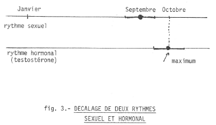 - En Amérique du Nord, des expériences ont été faites sur le rythme sexuel. Mille étudiants de moins de vingt-cinq ans ont noté les jours de leurs rapports sexuels au cours d’une année. On a pu constater en moyenne, une grande activité sexuelle au mois de Septembre. Par contre le taux de testostérone (hormone mâle) grandissait au mois d’octobre. Le maximum du rythme sexuel précède donc le maximum du rythme hormonal (fig. 3).