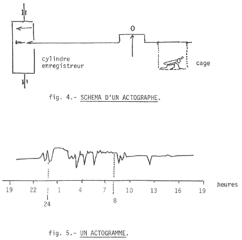 On réalise un actogramme en plaçant l’animal dans une cage suspendue à l’un des bras d’une balance sensible. A l’autre bras est fixé un stylet qui peut laisser sa trace dans le noir de fumée d’un cylindre enregistreur ; quand l’animal se déplace, le stylet enregistre ses déplacements.