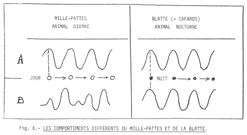 La Blatte, dans les conditions normales, a aussi un rythme circadien, avec des maxima la nuit (fig. 6 A) ; dans un milieu à température et à luminosité constantes, elle conserve ce rythme (fig. 6 B).