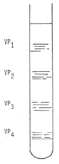 On peut en faire l’analyse par une électrophorèse dans un milieu gélifié en prenant un cylindre dans lequel on place un gel. Dans la partie supérieure on dépose une préparation des capsomères. On fait ensuite passer un courant électrique continu. En fonction de leur masse, et de leurs différentes caractéristiques physico-chimiques, les constituants protéiques des capsomères se séparent dans le gel. On voit apparaître alors des taches représentant un polypeptide séparé dont on connait la structure et le poids moléculaire. On les appelle VP (viral protéine) (fig. 14).
