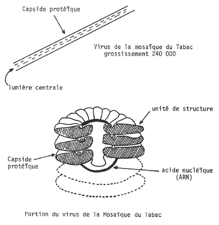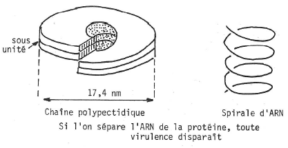 L’acide nucléique (ARN dans ce cas) une structure tubulaire sous forme d’un cylindre creux de 4nm de rayon. Autour s’articulent et s’enroulent en spirale continue les sous-unités protidiques. L’ensemble forme une baguette creuse, de structure hélicoïdale, longue de 30nm et d’un diamètre de 17,4nm.