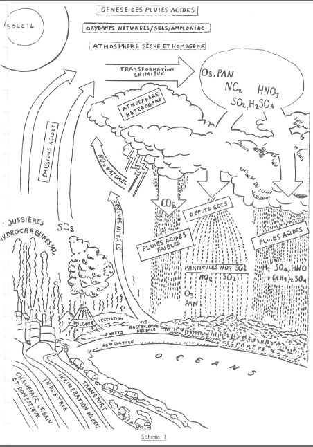 L’action du rayonnement solaire par exemple provoque une photolyse de l’ozone troposphérique qui réagit sur les molécules d’eau toujours présentes dans l’atmosphère, pour donner naissance aux radicaux oxhydriles OH ; ceux-ci très réactifs, se combinent avec le SO2 et les oxydes d’azote en phase gazeuse pour donner respectivement acides sulfurique et nitrique, des ions sulfate et nitrate.