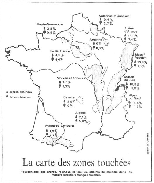 Depuis une dizaine d’années, en Europe Centrale et notamment en Allemagne, ce sont sur les écosystèmes forestiers que l’on a observé un dépérissement des arbres, phénomène qui s’est fortement accentué depuis 1982 et surtout 1983.