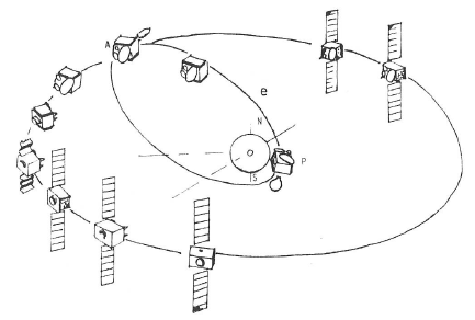 Lors de son passage à l’apogée (point A) de l’ellipse (e), un petit moteur est mis à feu pour arrondir la trajectoire.