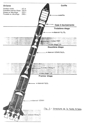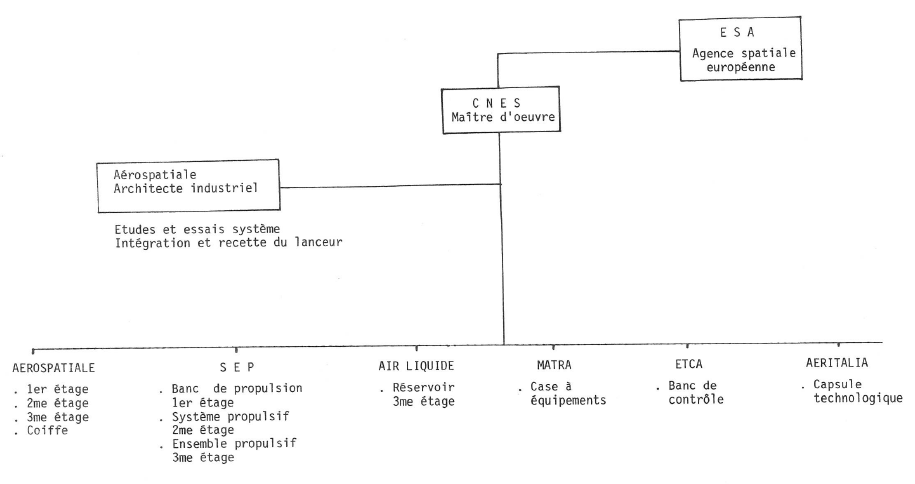 En 1973, l’Organisation Européenne de Recherches Spatiales – devenue en 1975, l’Agence Spatiale Européenne (E.S.A. en anglais) -, décidait d’entreprendre le développement d’un lanceur lourd, appelé Ariane, adapté à l’ensemble des besoins de la prochaine décennie. Neuf états membres (Allemagne Fédérale, Belgique, Danemark, Espagne, France, Italie, Pays-Bas, Suède, Suisse), apportent leur contribution à ce programme. L’E.S.A. a confié au Centre National d’Etudes Spatiales (C.N.E.S.) la maîtrise d’œuvre du programme.