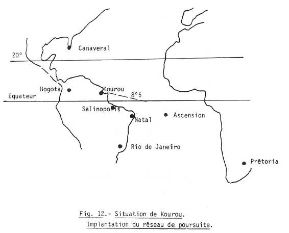 Le plan de lancement fait un angle de 7°5 avec celui de l’Equateur ; celui de la NASA, 28°8 ; Ariane bénéficie de l’effet dit « de fronde », ce qui procure un gain d’énergie de 17% par rapport à un lancement fait du Cap Canaveral.