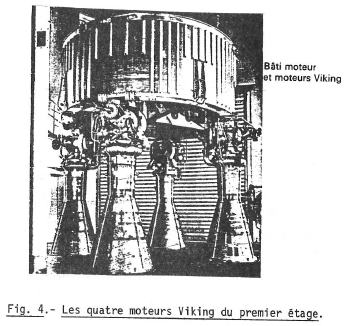 Les quatre moteurs Viking sont fixés symétriquement sur le bâti de poussée et articulés par paires autour de 2 axes orthogonaux (fig. 4).