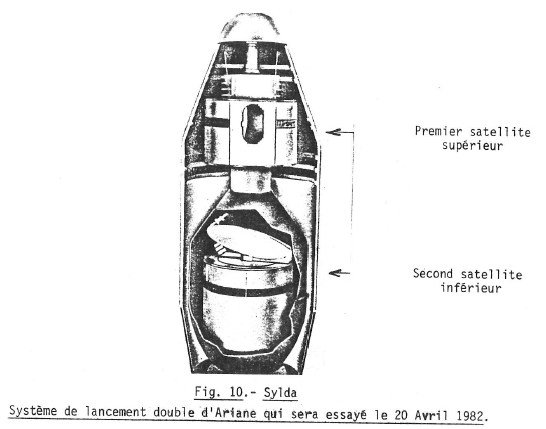 Récemment, on s’est demandé si l’on ne pouvait réduire le coût de lancement pour des utilisateurs qui voudraient des petits satellites. Pour cela, l’Aérospatiale a développé un système de lancement double (SYLDA) (fig. 10) constitué de deux coquilles s’emboitant l’une dans l’autre, renfermant deux satellites.