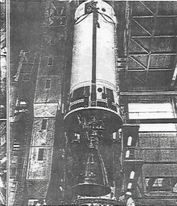 - Larguage des deux propulseurs à poudre, à 50 Km d’altitude, la vitesse étant de 5200 Km/h. Munis de parachutes, ils tombent dans la mer à 300 Km du point de départ, où on les récupère.