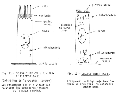 1. CELLULE EPITHELIALE DE LA TRACHÉE ARTÈRE (fig. 11), avec un cytoplasme pauvre en ribosomes, avec des mitochondries et des cils vibratiles.