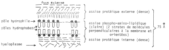 Le plasmalemme est une membrane fine de 75 Angström environ (1 Angström Å = 10-10m). Elle est feuilletée, composée chimiquement de lipides phosphorés et de protéines (fig. 2).