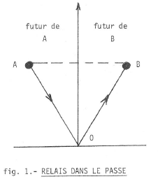 Par exemple, si A est éclairée : le message, envoyé dans le passé jusqu’au moment où ces deux particules étaient unies, sera à ce moment retransmis à B. Un message envoyé dans le passé modifierait le présent ; en somme, la propagation en arrière dans le temps d’un signal revenant vers le point de départ permettrait d’intervenir dans le passé à partir du présent ; dès lors deux particules distantes peuvent être corrélées parce que le résultat de l’observation décrit un zig-zag qui lui fait faire un détour par le passé. Un « potentiel avancé » porte le message dans un sens, un « potentiel retardé » dans l’autre (fig. 1).