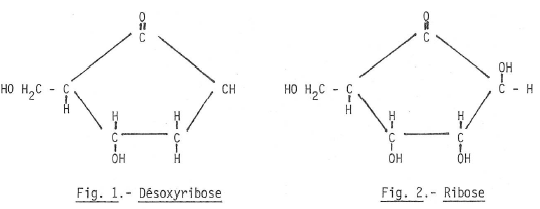 - Dans les nucléotides de l’A.D.N. le sucre est le désoxyribose (fig. 1) tandis que dans l’A.R.N. le sucre est le ribose qui renferme un atome de plus d’oxygène (fig. 2).