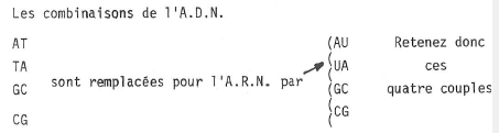 Puis, à l’intérieur d’un ribosome, il va s’agrafer, avec son triplet de bases, à un triplet de l’A.R.N. messager, suivant l’association des Bases :