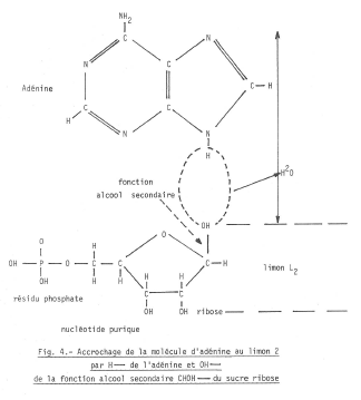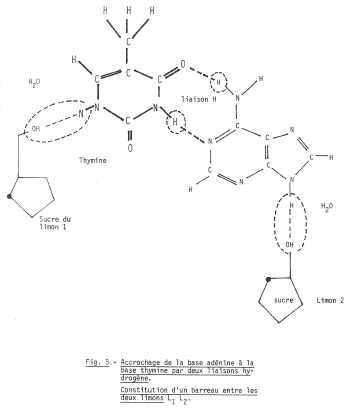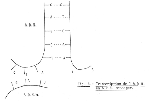 Les nucléotides des A.R.N.m s’appliqueraient le long de l’une des chaînes (un limon) momentanément dégrafée de l’autre (fig. 4). Il y aurait une sorte de moulage de l’A.R.N. à partir de l’A.D.N. servant de matrice.