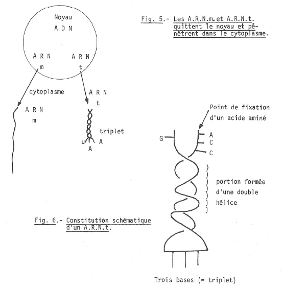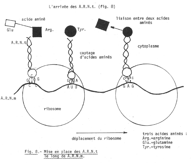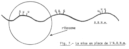 L’A.R.N.m. gagne un ribosome (élément du cytoplasme) avec le moulage du code génétique) (fig. 7).