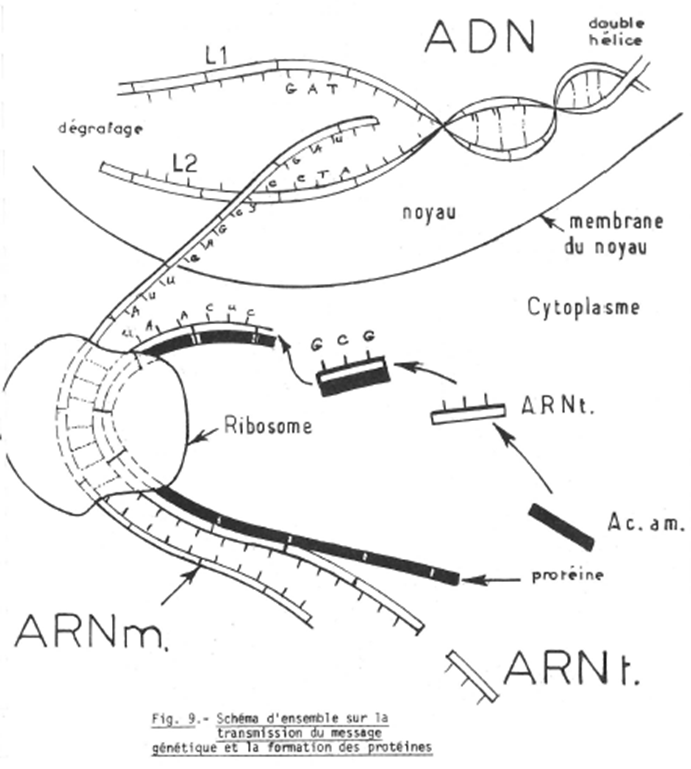 Le schéma ci-joint (fig. 9) donne une vue d’ensemble sur la transmission du message génétique et la formation des protéines.
