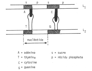 La longue molécule.de l’A.D.N. est constituée par deux brins (L1 – L2) qui s’enroulent l’un autour de l’autre en formant une double ; les brins sont réunis par des bases qui sont comme des barreaux d’une échelle ; nous avons désigné ces barreaux par 4 lettres A, T, G, C, assemblées de la sorte AT, TA, GC, CG.