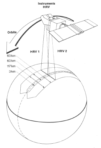 Avec une orientation convenable du miroir d’entrée de l’instrument H.R.V. contrôlée par télécommande, il est possible d’observer des régions intéressantes qui ne sont pas nécessairement à la verticale du satellite. Elles peuvent être situées dans un couloir de 950 km de large de part et d’autre de la trace au sol du satellite. La largeur de la zone effectivement observée varie entre 60 km à la verticale du satellite et 80 km en visée oblique extrême (-27°).
