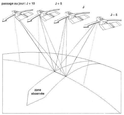 Outre ces caractéristiques, le satellite S.P.O.T. offre la possibilité de faire varier la direction d’observation jusqu’à plus ou moins 27° de la verticale du satellite par rapport au plan d’orbite. Cette particularité a deux avantages : bonne répétition des observations et vision stéréoscopique (voir figure).